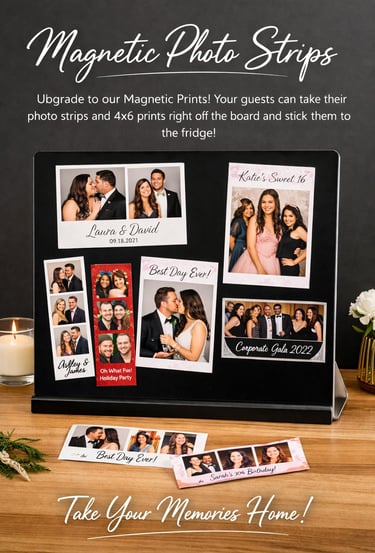 Turn your photo booth moments into memories that stick. This fun upgrade transforms your 4x6 or 2x6 photo strips into custom magnetic photos your guests can take home—perfect for fridges, lockers, and memory boards.